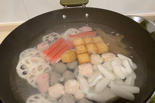 2.不容易熟的先煮,煮丸子,蝦,魷魚,年糕,寬粉。葷菜也可以用油煎熟,簡單點就一起煮瞭,省事,味道也差不多。蟹棒一定帶皮煮,也不要煮過爛,因為一會炒會碎掉!!!