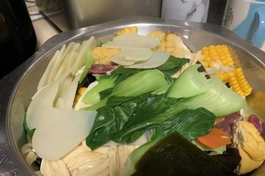 3.水裡加點鹽,煮青菜蘑菇,金針菇,木耳,玉米等青菜煮至9分熟。菜不要煮太爛,一會兒還要炒香。腐竹、土豆片是比較容易爛的食材,煮的時候要控制好,否則炒出來就是一鍋醬啦……
