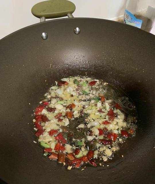 5.起鍋熱油下花椒幹辣椒炒出香味,然後下蔥薑蒜繼續炒香
