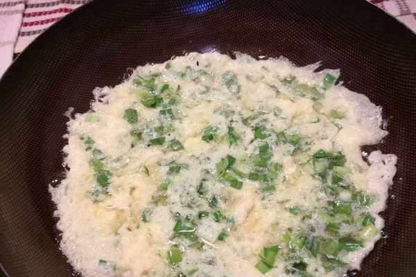 5、接著鍋中準備好足量的油,準備的油甚至可以多一些,燒熱,然後加入攪拌好的雞蛋,下鍋煎炸至定型,像是圖中這樣,油溫夠熱的時候,雞蛋下鍋就會迅速產生氣泡膨脹。