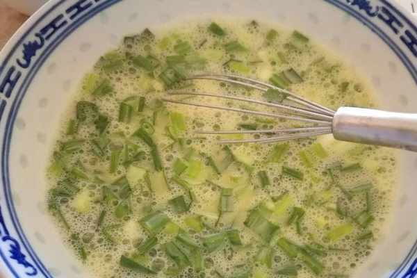 4、雞蛋裡面加入蔥花,少量的鹽和胡椒粉,用蛋抽攪拌均勻,讓蛋液和蔥花混合均勻。