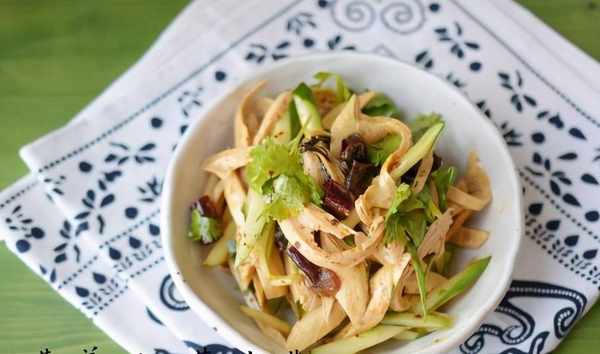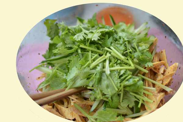 3,調料汁和香菜碎,黃瓜絲加入豆節絲中攪拌均勻即可