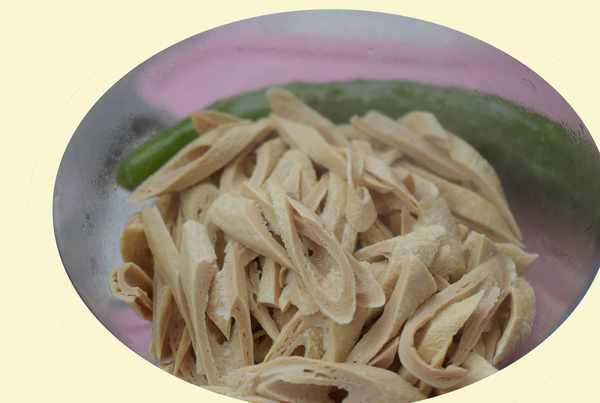 豆節200g,黃瓜1根,香菜適量,辣椒油,生抽,鹽,花椒油,芥末油,砂糖,蒜蓉