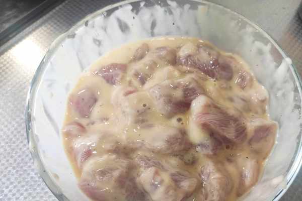 2、豬肉切成小塊,加入料酒、生抽、淀粉、鹽少許、蛋清,抓勻,醃制15分鐘,經過醃制的肉塊,特別入味。