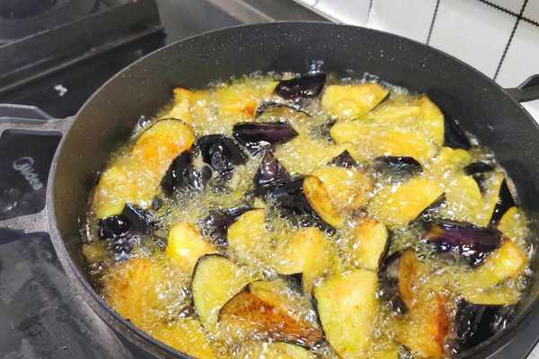 5、再把茄子倒入鍋中,炸至熟就馬上撈出來控油,不要炸到軟趴趴,會影響口感。