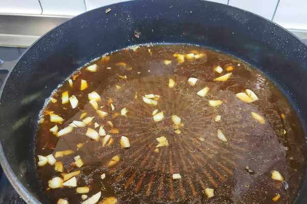 6、把鍋中的食用油全部倒出去,剩少許鍋底油,加入蒜末,炒出香味。再把剛才調制好的料汁,全部倒入鍋中,煮一會兒,煮至有點冒泡泡。