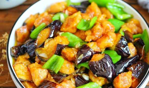 7、加入炸過的肉段、茄子和辣椒,快速翻炒兩下就可以出鍋瞭,好吃又過癮的傢常菜。