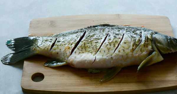 去掉水分後,案板也保持幹燥,給魚身上劃幾個口子,便於入味。如果是燉魚湯,做到這裡就可以下鍋煎瞭,如果不是燉魚湯,就要把洗凈的魚醃制一會兒再擦幹。