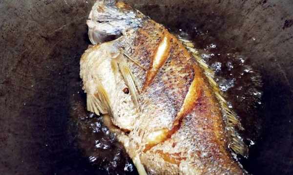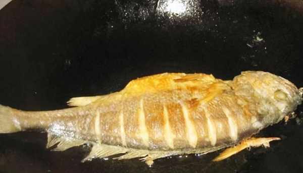 再次燒熱到冒煙,將熱油倒出,倒入涼油,油的量比平常炒菜用油多一點,這時把魚放進鍋內,開小火慢煎。