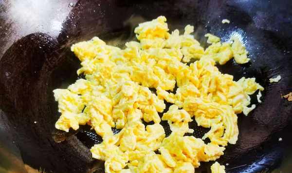 第二步:起炒鍋,鍋中加入適量食用油,待油溫5成熱時,將打散的雞蛋液倒入炒鍋中,然後迅速用鏟子將雞蛋液劃散,炒至金黃,盛出備用。