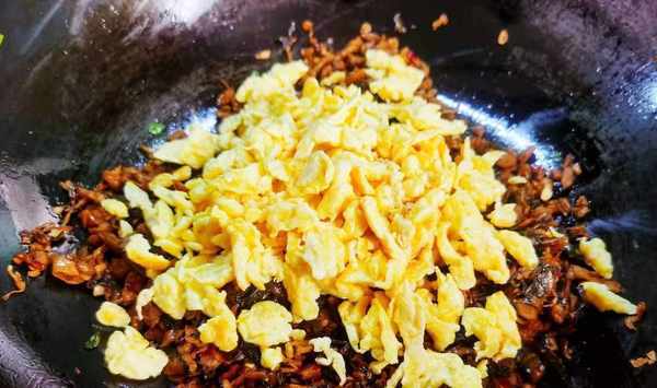 第四步:炒至幹巴巴後,再將盛出的雞蛋丁倒在外婆菜上面,再加入少許食用鹽和一勺生抽,翻炒均勻入味,出鍋前撒上備好的蔥花,即可關火出鍋。這道雞蛋炒外婆菜就做好瞭,簡單省時,味道超絕,尤其是搭配米飯吃,傢人都嫌米飯不夠吃喲!