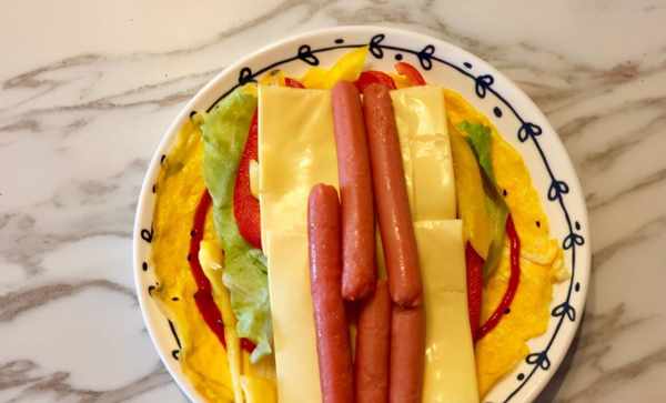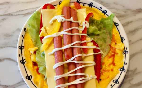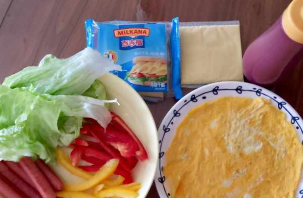 [所需菜品]:雞蛋2個,彩椒適量,小Q腸3根,生菜適量,芝士片2片,黑芝麻少許,番茄醬適量,沙拉醬適量,鹽一點。