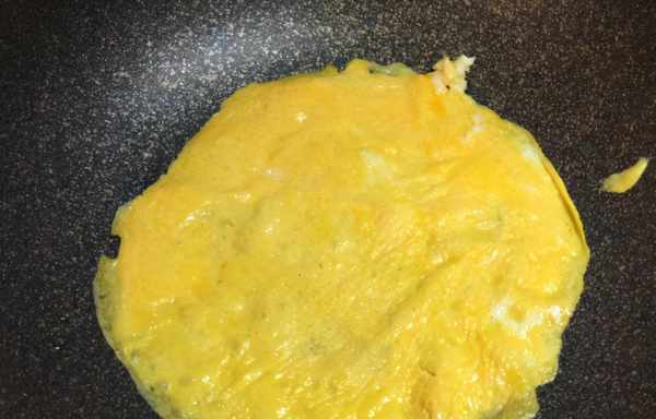 1、打兩個雞蛋,攪拌均勻,攪拌雞蛋時,可以在雞蛋裡放入三分之一勺的鹽,和雞蛋一起攪拌均勻,盡量把鹽攪拌至融化,鍋中開小火,把雞蛋液倒進鍋裡,攤成薄薄的雞蛋餅。