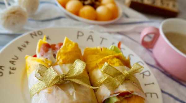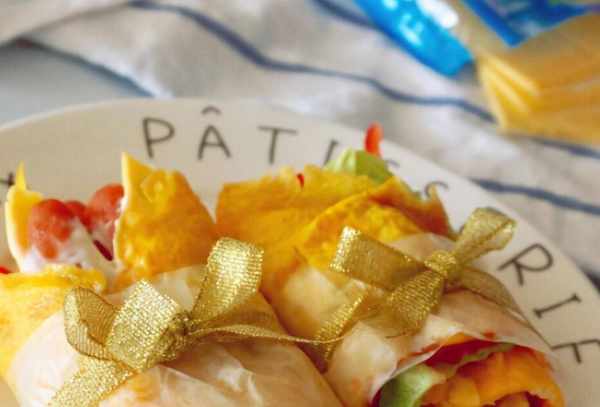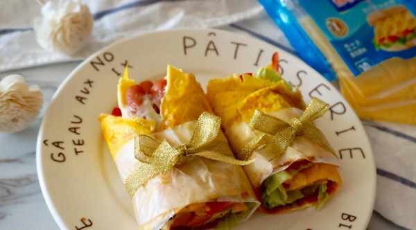 11、接著把蛋皮輕輕地裹起來,別太用力,免得拽破蛋皮,就包不上瞭,卷好的蛋卷切成兩半,用油紙包起來,美味的火腿芝士時蔬蛋卷就做好啦,是不是很心動呢,這道菜是早餐佳品哦,非常適合上班族的一道快手早餐,搭配果汁或者水果來食用,都非常的棒,接下來一起來看下這道菜的成品圖吧。