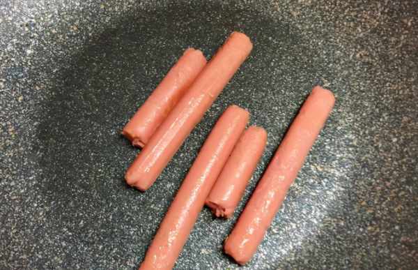 2、把小Q腸放進鍋裡煎一煎,這個火腿腸非常小,沒有大火腿腸占地方,所以不需要切成兩半。