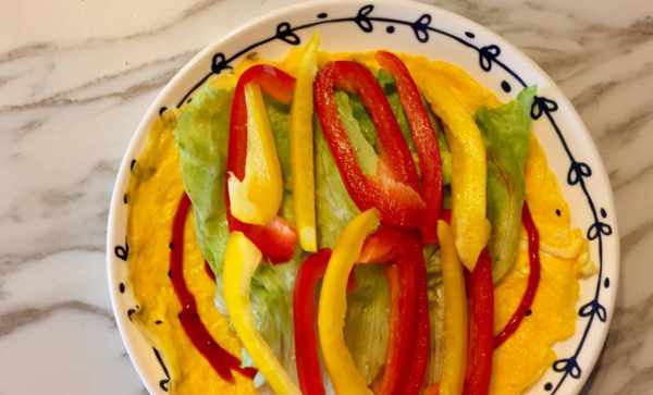 3、攤好的雞蛋餅和小Q腸裝盤備用,把生菜洗幹凈,紅椒和黃椒清洗幹凈切成條,裝盤備用。