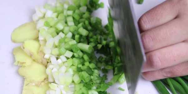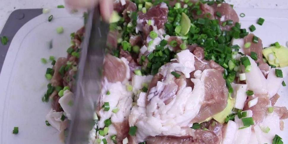 我們先把肉切成大塊的,再切成小塊,然後把準備好的生薑和蔥花放在肉上面一起剁,這樣生薑和蔥花就能和豬肉更好地融合。很多人會嫌手工剁餡費時又費力,但其實用手工剁出來的肉餡比用機子攪的肉餡更有勁道,口感也會更好。