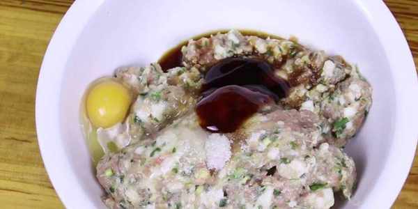 肉餡剁好之後再來調味,先打入一個雞蛋,雞蛋會使肉餡更加滑嫩,再加入適量的食鹽,一些白糖提鮮、兩勺生抽、一勺料酒、一點蠔油。