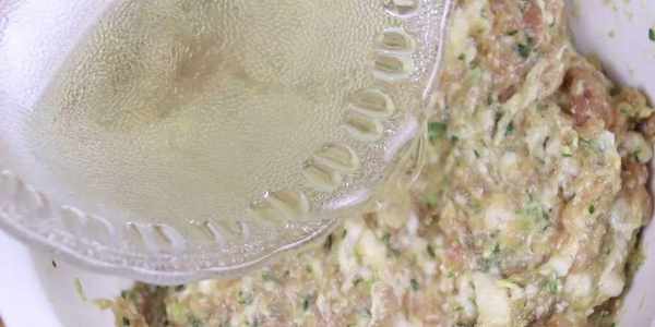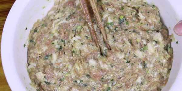 攪拌得差不多瞭,再把放涼的花椒水加入進來,在加花椒水時不要一次性全部倒進來,要分幾次慢慢添加,邊加花椒水邊攪拌,很多朋友可能不知道為什麼肉餡要加花椒水,加瞭花椒水調出來的肉餡沒有肉腥味,而且味道也很鮮美。