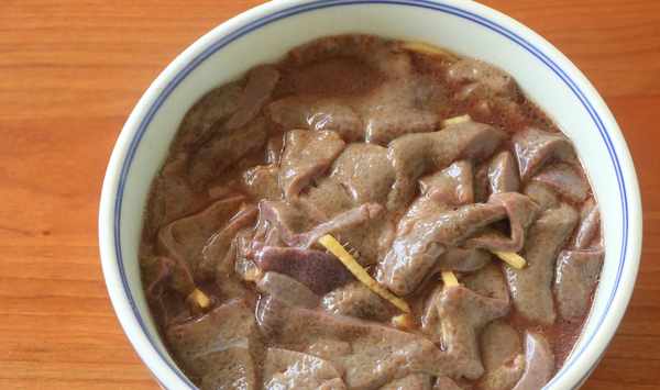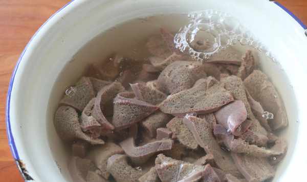 4、再把豬肝焯一下水,撈出來清洗幹凈備用;