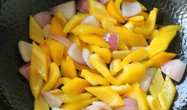 6、鍋中熱油,把蒜片加進去翻炒出香味,再把洋蔥和彩椒加進去翻炒均勻;