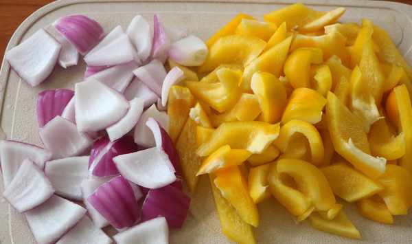 5、洋蔥、彩椒洗凈切成小塊備用;