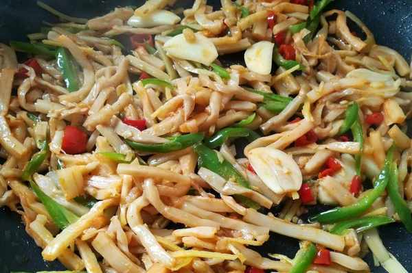 6.加入酸筍翻炒均勻,加生抽翻炒上色。