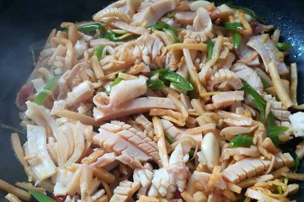 7.加入焯過水的墨魚幹,開大火翻炒均勻。