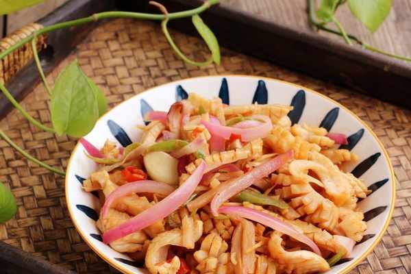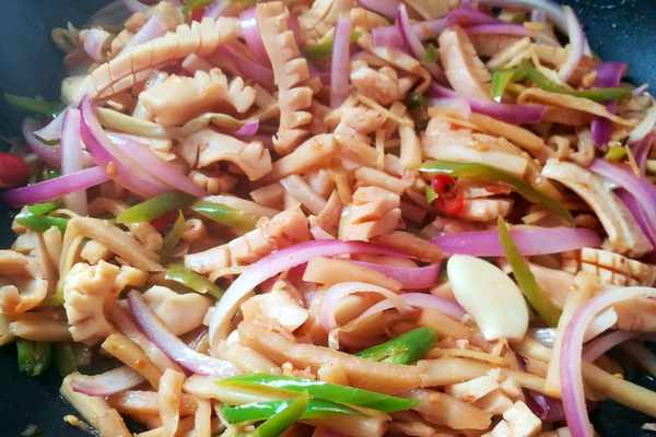 墨魚幹是新鮮的墨魚加工後的海產品。墨魚雖然叫魚,卻不是魚,沒有魚刺,沒有魚骨也沒有魚鱗,屬於貝類。墨魚跟魷魚長得比較像,要比魷魚更有營養,經常吃墨魚有滋補身體的好處。墨魚營養豐富,含有蛋白質、維生素A、B和鈣鐵等多種營養元素。墨魚幹最大的優點是高蛋白、低脂肪、低熱量,每100克墨魚含蛋白質13克,脂肪0.7克,熱量64千卡。墨魚幹可以用來煲湯,也可以用來做炒菜。用墨魚幹炒酸筍,營養鮮美又下飯,傢人吃得很滿意,一盤全都吃光瞭,老爸誇它比燒烤還好吃。今天就給大傢分享一下酸筍炒墨魚幹的做法,需要準備的食材有:墨魚幹適量,料酒1勺,生薑1塊,蒜米3瓣,洋蔥半個,線椒2個,泡椒3個,生抽1勺,鹽適量,食用油適量。