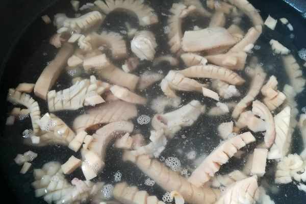 4.墨魚幹加冷水焯水煮10分鐘,撈出來清洗幹凈。如果用的是剛剛清洗出來的墨魚幹,焯水一次就可以瞭。
