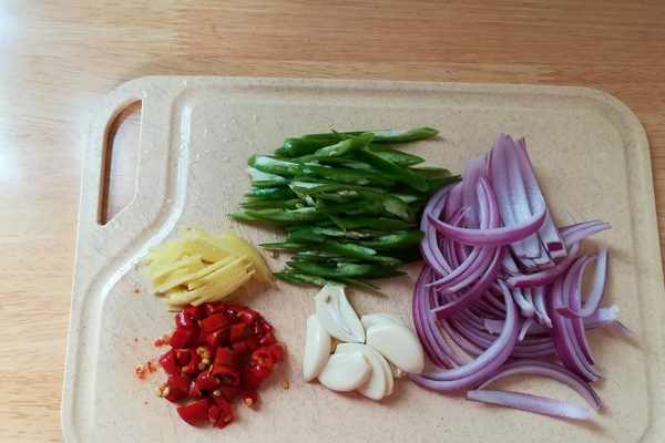 2.洋蔥清洗幹凈切細條,蒜米去皮切片,線椒斜著切小段,泡椒切段,生薑切薄片。