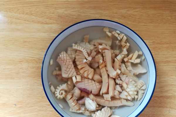1.墨魚幹解凍後加料酒加水浸泡半個小時。如果是整個的墨魚幹,提前泡半天,撕掉墨魚幹紫色的外皮,把裡面的一層硬物拆出來,切花刀切小塊,冷水進鍋,焯水煮到墨魚幹卷起來撈出來清洗幹凈。