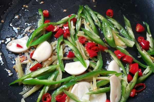 5.熱鍋放油,放入薑片,蒜片,泡椒和線椒,小火翻炒出香味。