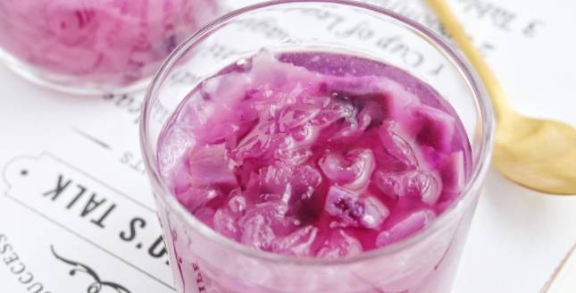 6、再將冰糖也下進去,直到將冰糖煮的融化瞭關火就可以瞭。粘稠軟糯爽滑的銀耳羹就做好瞭,燉好的紫薯銀耳羹,顏色超級漂亮,粘稠的銀耳膠質與軟糯的紫薯結合,口感非常棒!夏天喝上一碗溫溫的糖水,比吃一個冰淇淋都涼爽。如果你是廚房小白也不用愁,簡單幾步就能學會。