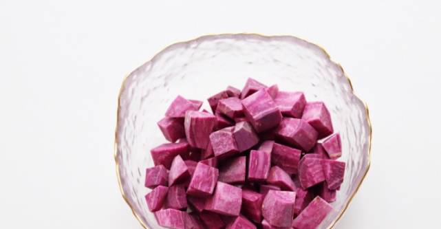 4、把紫薯的皮去掉,切成小塊,準備好。紫薯大傢不用準備的大個的,要是大的大傢可以切成一半來做這個銀耳羹。