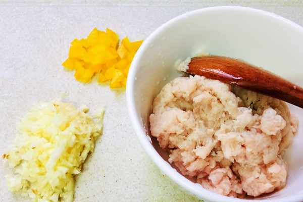 第二步:將猪肉、大蒜和彩椒分別處理成末備用。猪肉我用的是純瘦肉,也可以用少許肥肉綜合下口感,彩椒是用於點綴,紅色或者黃色都可以,就地取材用,沒有的話也可以不放。