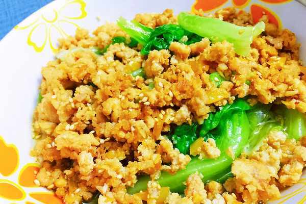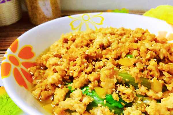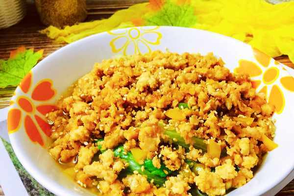 第五步:將煮好的肉末醬汁直接淋到生菜上,再往上面撒一些熟芝麻做點綴,這樣一道香噴噴的"蓋澆生菜"就做好了~