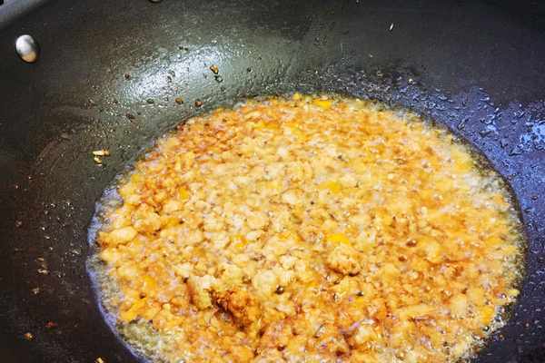 第四步:重新起鍋下入適量油,放猪肉末和蒜末大火煸炒勻,加入彩椒末、適量蚝油、生抽、白糖和清水繼續煮沸至濃稠。