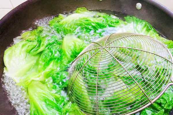 第三步:鍋裏加入多一點清水,燒至沸騰後加入適量的油鹽,下入洗淨的生菜均勻焯煮1分鐘,撈出控一下水分碼入盤。