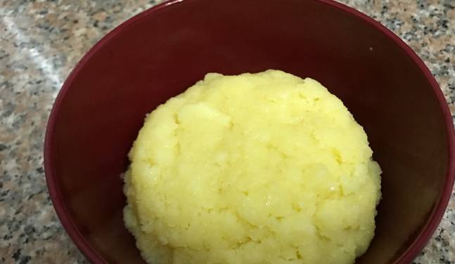 5、隔水大火蒸15分鐘即可,蒸制的過程中每5~6分鐘就用筷子攪拌一下,以免蒸出來的奶黃餡中間不熟。時間到瞭以後把奶黃餡取出來就可以瞭,濃濃的奶香味,實在太喜歡瞭。