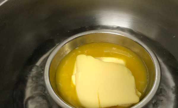 1、我們先來制作奶黃餡,黃油先放進小盆裡面,然後鍋裡面燒開熱水,把黃油放進熱水裡面隔水融化。