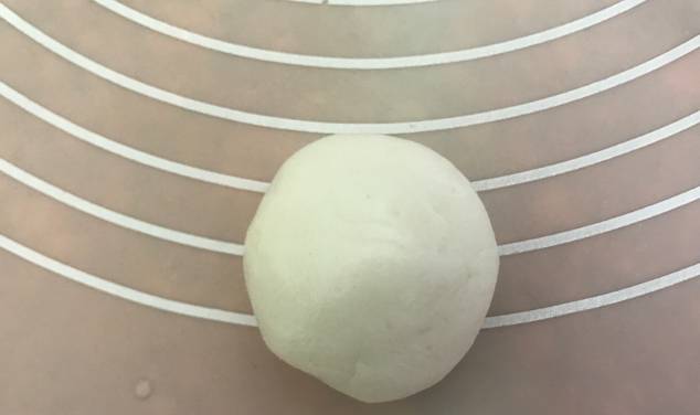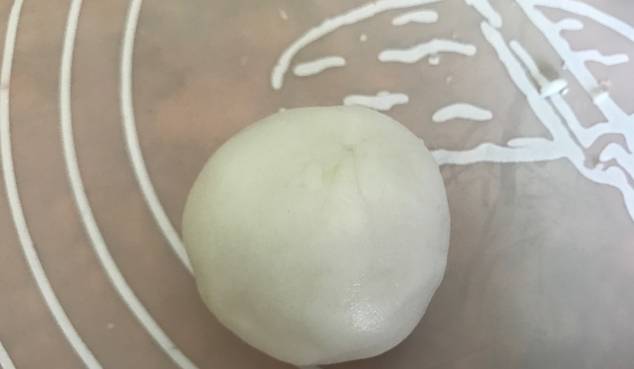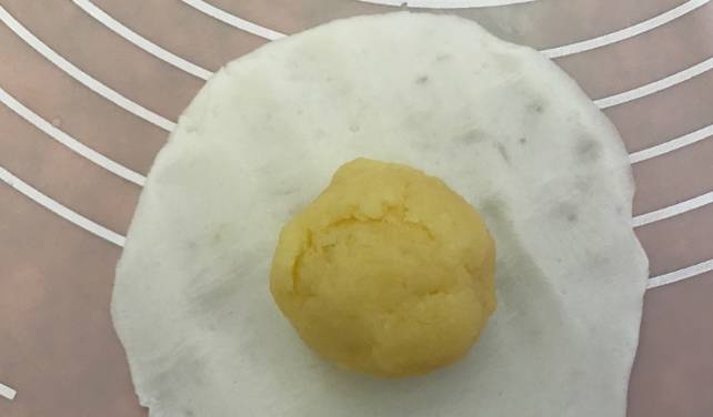 8、將小面團搟薄瞭以後把奶黃餡包進去,捏緊瞭以後慢慢地收口,將面團搓成湯圓狀的餅胚。