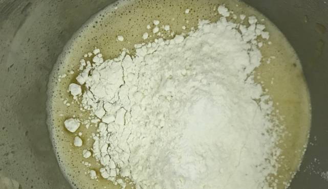 3、然後再將面粉篩進去,和奶粉攪拌均勻,至到無顆粒。把牛奶也加進去攪拌均勻。