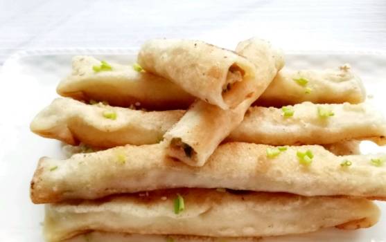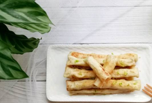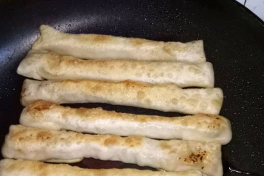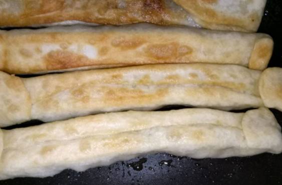 6、鍋中放油,油熱以後逐個放入包好的褡褳火燒,小火煎至一面金黃時給火燒翻面。