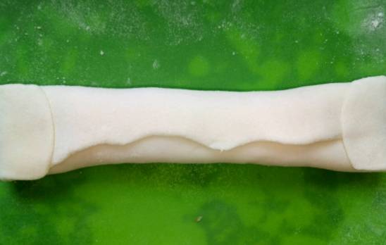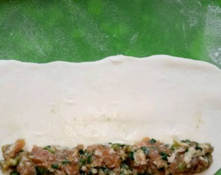 4、用手按扁,用搟面杖搟成長大概15厘米,寬大概8厘米的薄片,把冰箱裡醃入味的餡料拿出來,在薄面皮的一邊整齊地放上肉餡,具體可以看圖操作。