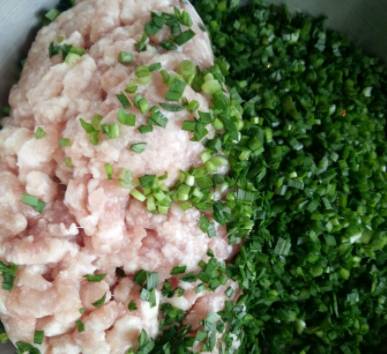 1、把豬肉切碎,別切得太大塊,韭菜切碎、生抽、鹽、香油倒進肉餡裡攪拌均勻,放入冰箱冷藏4小時左右讓肉餡入味兒。