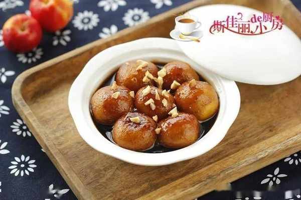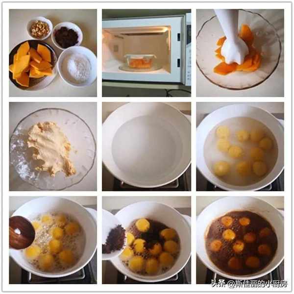 制作:將南瓜去皮後切成片後放入保鮮盒中,在微波爐中高火三分鐘打熟(如果沒有微波爐,可放入蒸鍋中將南瓜蒸熟),將熟南瓜用電動攪拌器攪打成泥(或者用勺背按壓成泥),加入適量的糯米粉混合成光滑的糯米南瓜面團, 再取出少許面團搓成南瓜糯米丸子。 燒鍋水, 將南瓜糯米丸子放進水中去煮, 丸子煮熟後盛出來大部分水,隻留少許水, 加入1小碟紅糖,再大火收汁讓紅糖汁均勻的裹在南瓜糯米丸子上;盛出來後撒上熟花生碎即可。