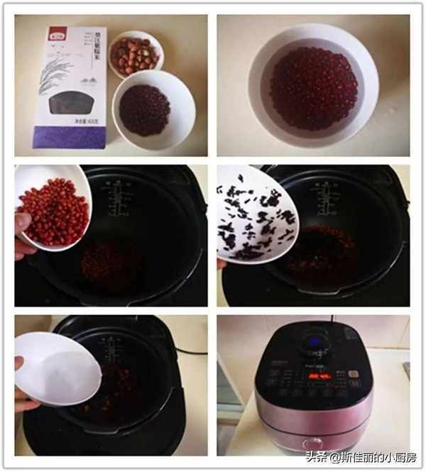 制作:我們要提前將不易煮爛的紅豆用冷水泡上一晚上,再將泡好的紅豆放入電壓力中鍋中,再將洗好的紫糯米和花生米放入電壓力鍋中(註意如果選用普通鍋具,紫糯米和花生米,也需提前浸泡1-2個小時) ,再一次性加入足量的水(註意煮粥時不要分次加水),再按下電壓力鍋燉煮豆粥的功能鍵,時間到, “紅豆花生紫米粥”就煮好瞭。