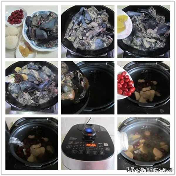 制作:熱鍋涼油,將準備好的烏雞塊放進鍋中煸炒至無水分,再加入少許薑片進去翻炒幾下,加入1小塊紅糖均勻,這樣炒過的烏雞塊煲湯口感更好, 將炒過的烏雞塊放入電燉鍋中,放入準備好的猴頭菇和紅棗, 一次性加入足量的水(註意煲湯不能中途加水); 按下電燉鍋煲雞湯的功能鍵,時間到,湯煲煮好後加入少許鹽和胡椒粉調味,最後放入蔥花即可。