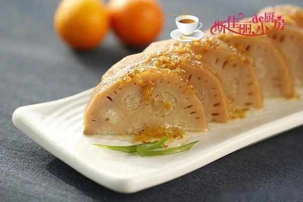 制作:先將糯米洗凈後提前浸泡三十分鐘,將蓮藕臨近底端的五分之一處切開, 在蓮藕孔洞中灌入泡好的糯米,灌時用筷子幫忙按壓,註意不要孔洞不要灌得太滿; 再將切下來的蓮藕塊蓋上用牙簽插入固定。將蓮藕放入電飯煲中,加入沒過食材的水,加入適量的紅糖,按下燉煮的功能鍵,將蓮藕燉煮熟後再浸泡一段時間,這樣"紅糖糯米藕"就煮好瞭,去除牙簽後再切成片,擺放在盤中,淋上少許糖桂花即可。